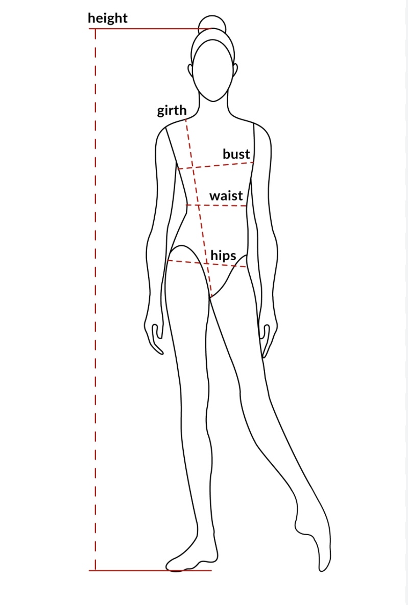 chest, waist, hips (fullest part of the bum) and Girth… Pass the tape measure through the legs and unto one shoulder, (the girth is the torso measurement). If you are  not making a leotard  for anyone I will choose a size for you to make.
