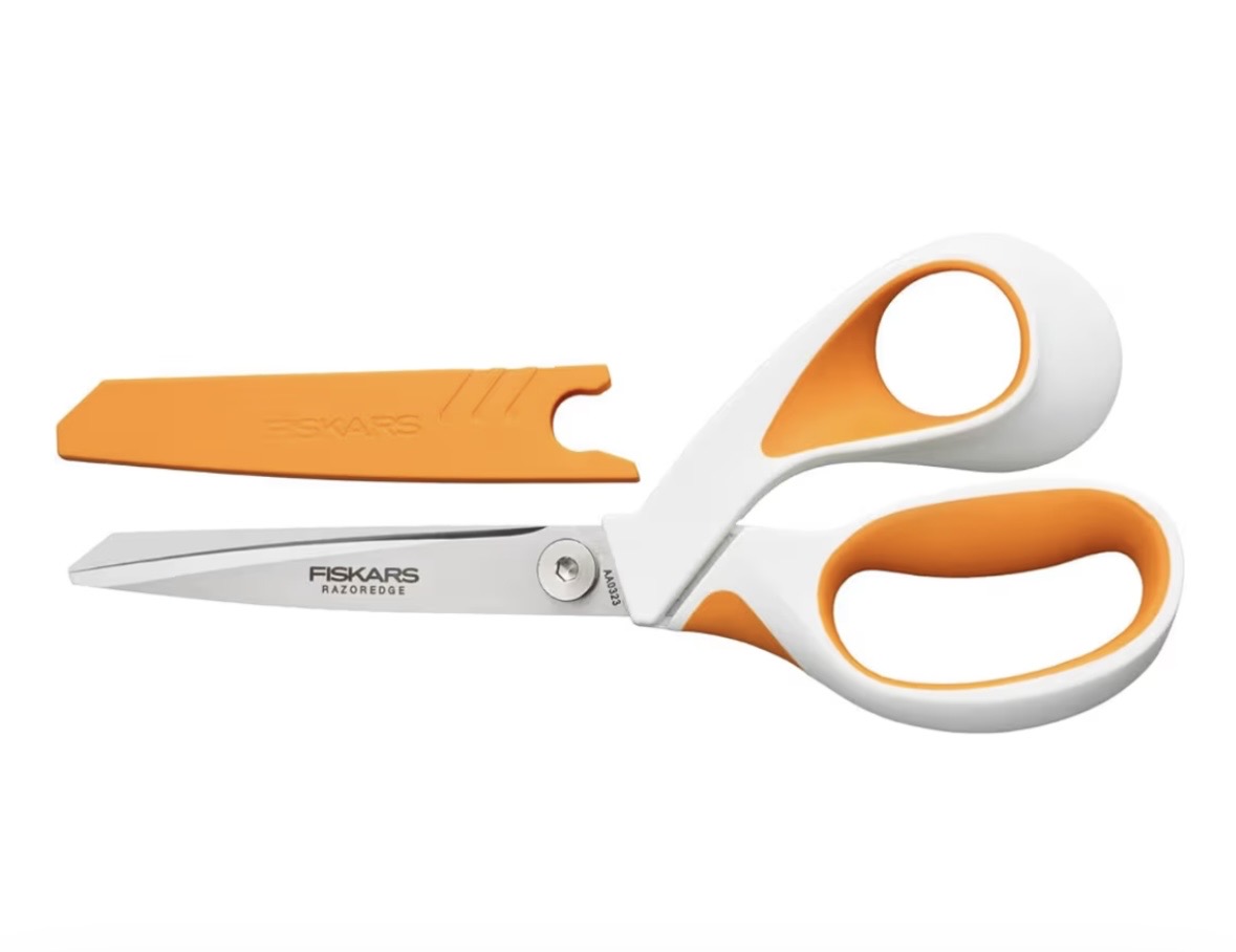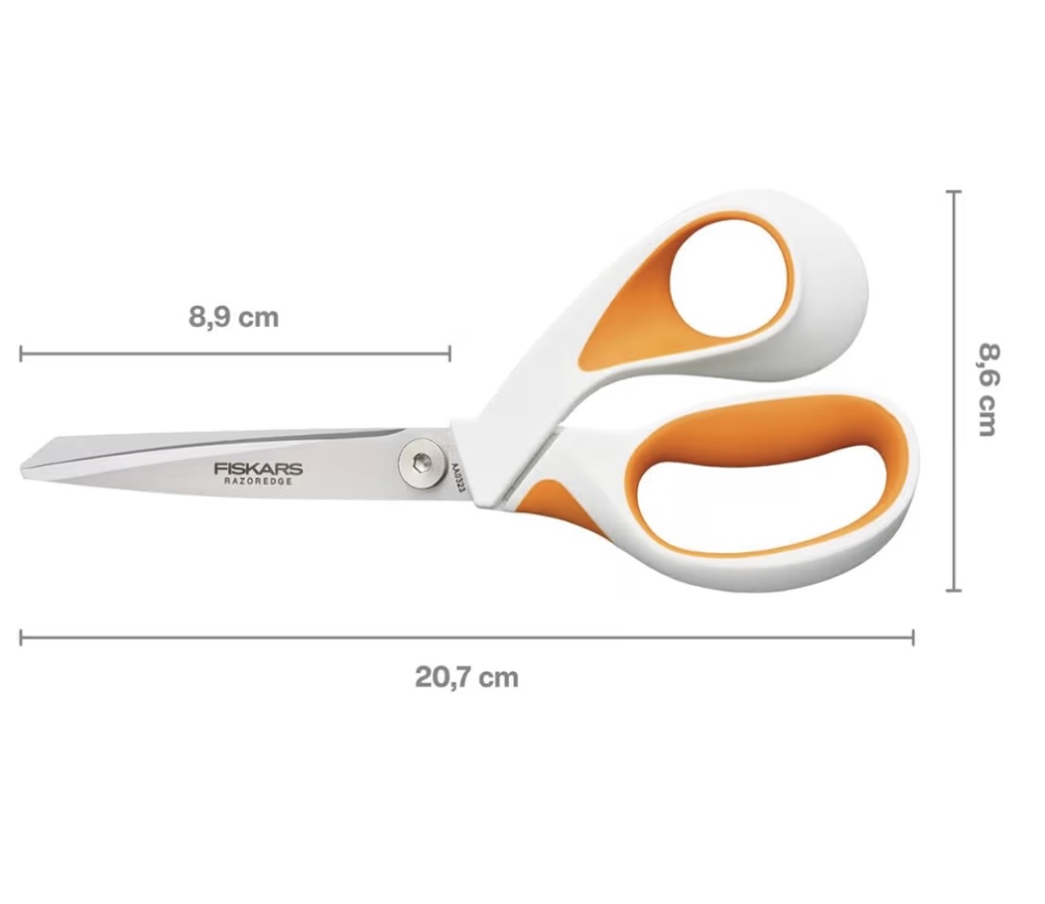 These Scissors by Fiskars are a necessity for a completely smooth cutting movement. the blade length is 8.9cm. They cut through stretch fabrics beautifully, I have tried and tested them!
