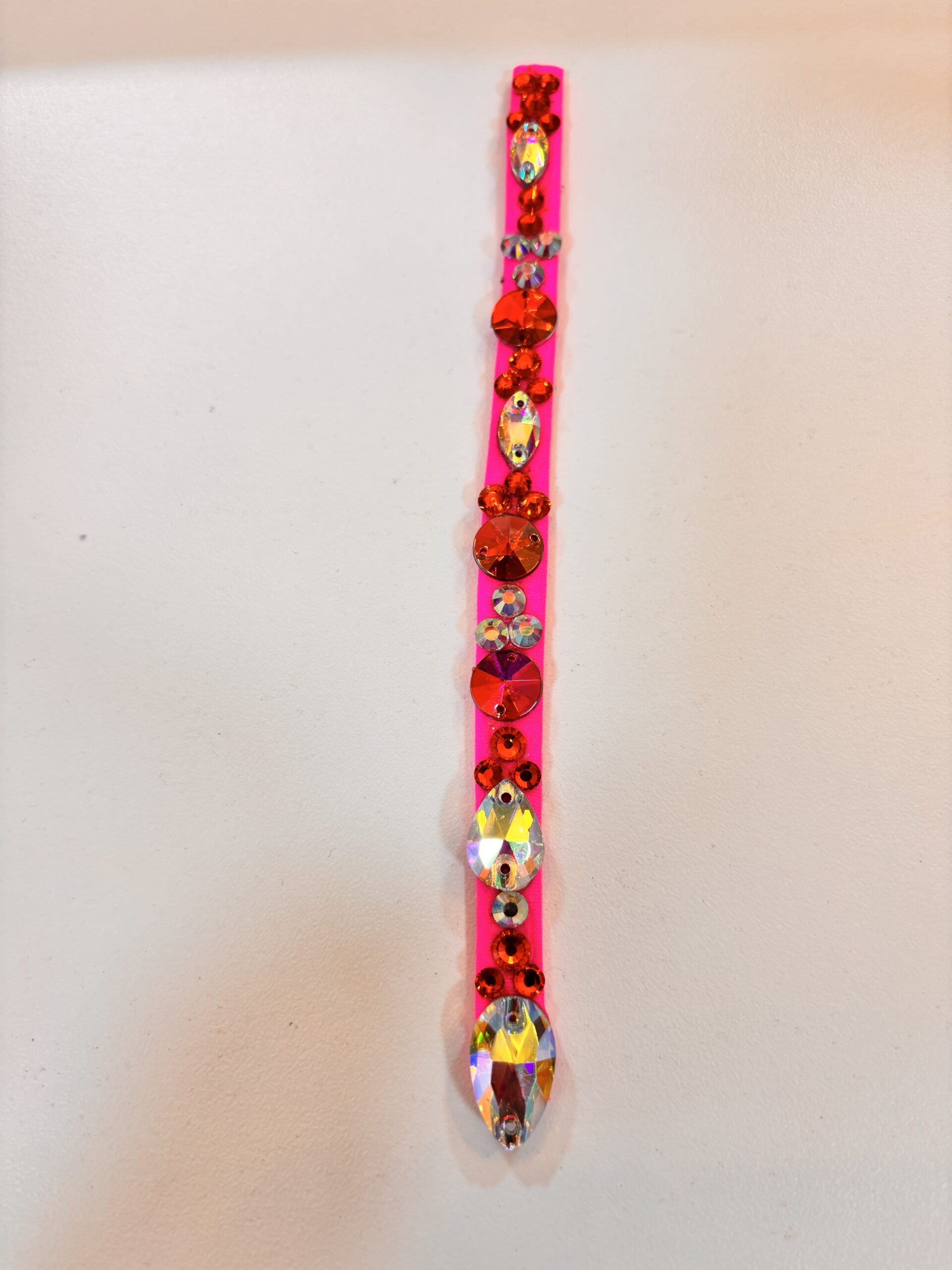 A sparkling rhinestone parting strip are sure to finish off your dance costume, they are ideal for dance competitions, showcases, performances. The Strips come in lots of colours. They can be applied to the scalp with Spirit Gum (not included). 16cm long