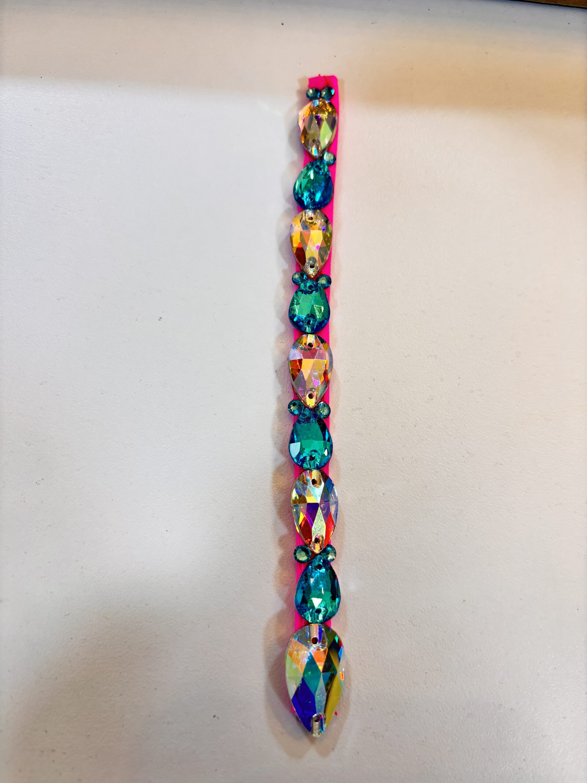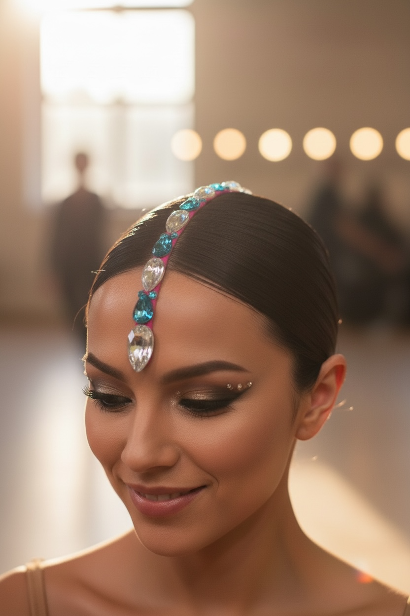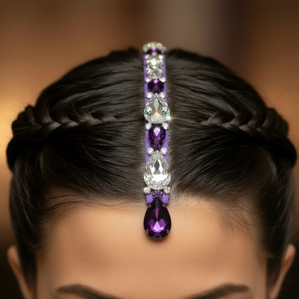 A sparkling rhinestone parting strip are sure to finish off your dance costume, they are ideal for dance competitions, showcases, performances. The Strips come in lots of colours. They can be applied to the scalp with Spirit Gum (not included). 16cm long
